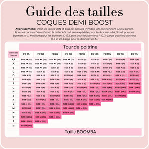 Pour le modèle Demi Boost, la taille Extra-Small sera expédiée pour les tailles AA, la taille Small pour les tailles A, B et C, la taille Medium pour les tailles D et E, la taille Large pour les tailles F et G, la taille Extra-Large pour les tailles H, I et J, et la taille 2 Extra-Large pour les tailles K, L et M.