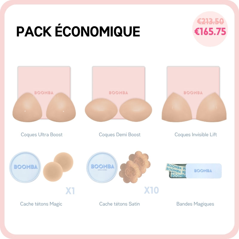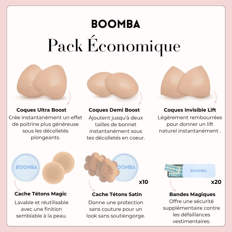 Les coques BOOMBA sont des coques au rembourrage unique qui rehaussent instantanément et ajoutent jusqu’à 2 tailles de bonnet en un clin d’œil. Elles vous donnent ce superbe décolleté en un instant !