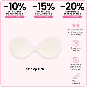 COMMENT RETIRER: Pour enlever votre Sticky Bra, dégrafez et décollez délicatement un bonnet à la fois, en commençant par le bord extérieur supérieur. Reapply the protective films to the bra and store it in the BOOMBA gift box, away from direct sunlight.