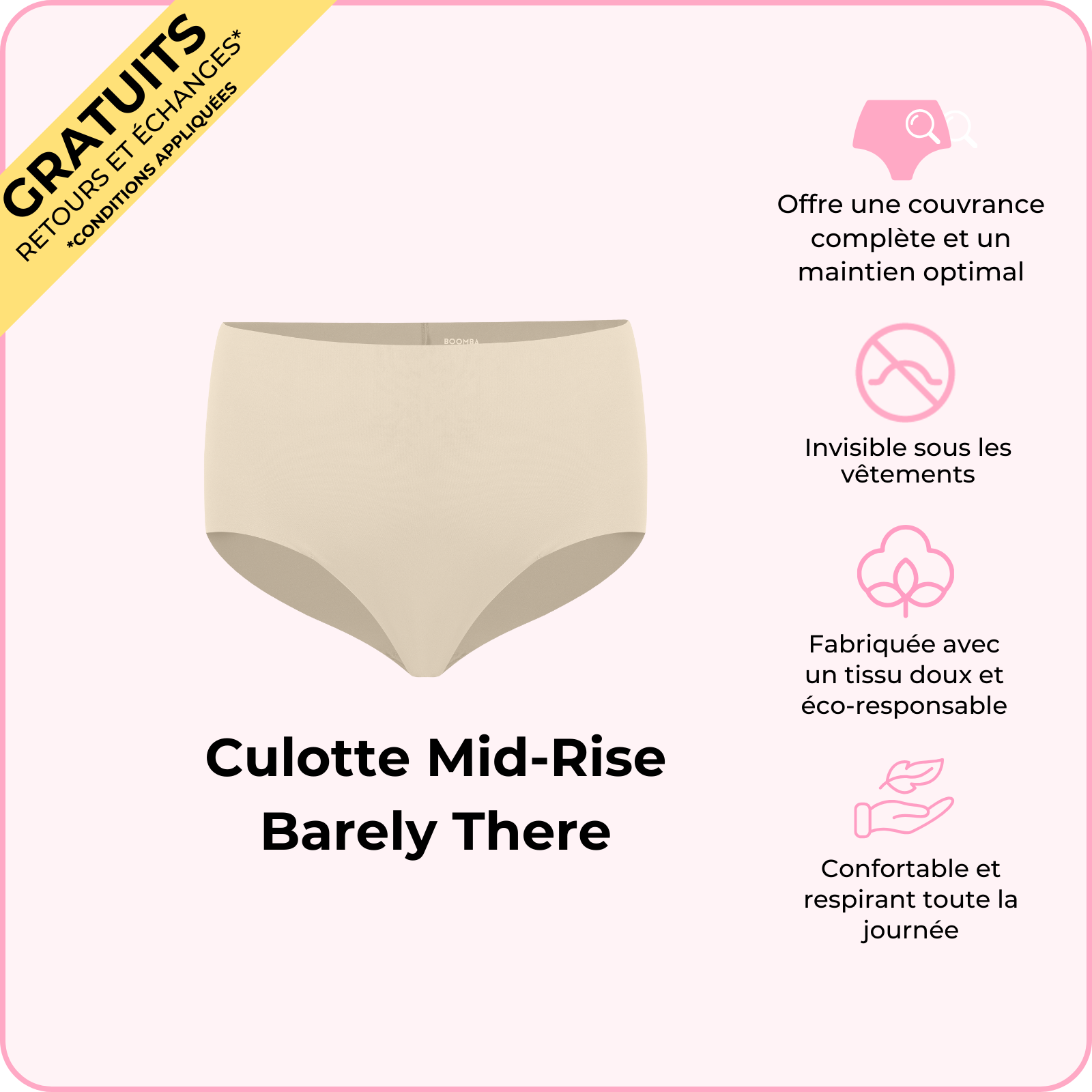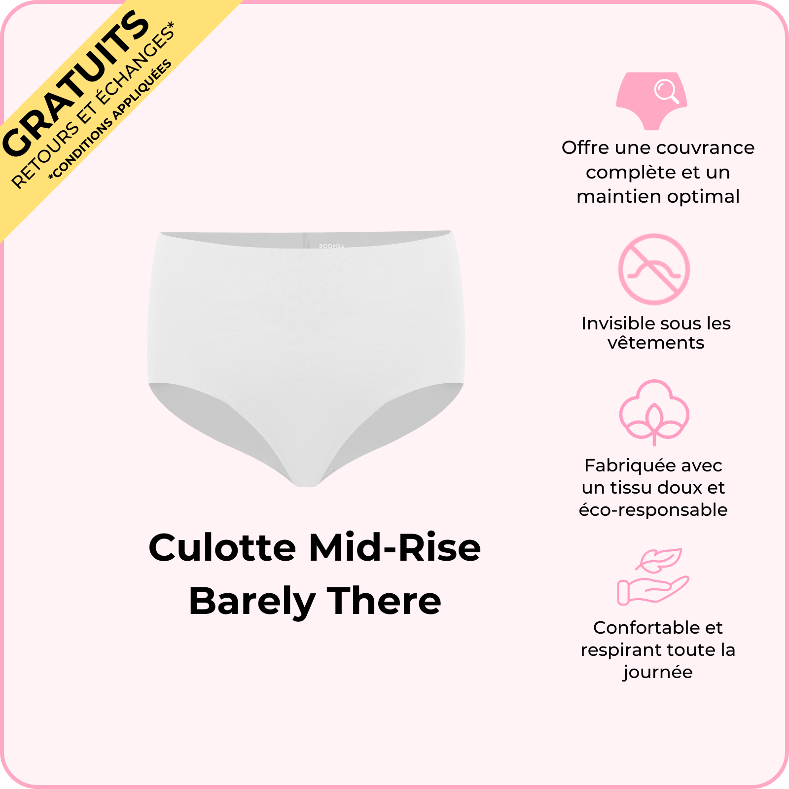 La Culotte Mid-Rise Barely There Boomba, c'est comme un câlin pour vos hanches — confortable, mignonne et totalement invisible ! Fabriquée dans un tissu ultra-doux et sans coutures, elle donne l'impression de ne rien porter... mais dans le meilleur sens possible. Sa coupe taille mi-haute et son design échancré subliment vos courbes, en faisant votre nouvel indispensable pour tout, des soirées Netflix aux rendez-vous amoureux. Enfilez cette pièce irrésistible et ressentez le confort tout au long de la journée !
