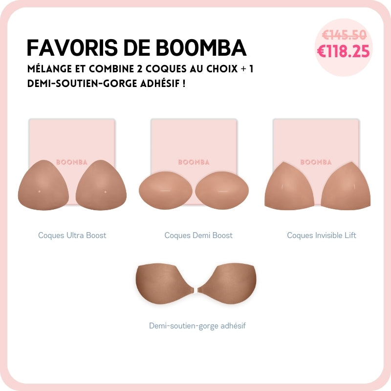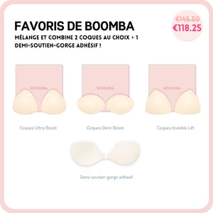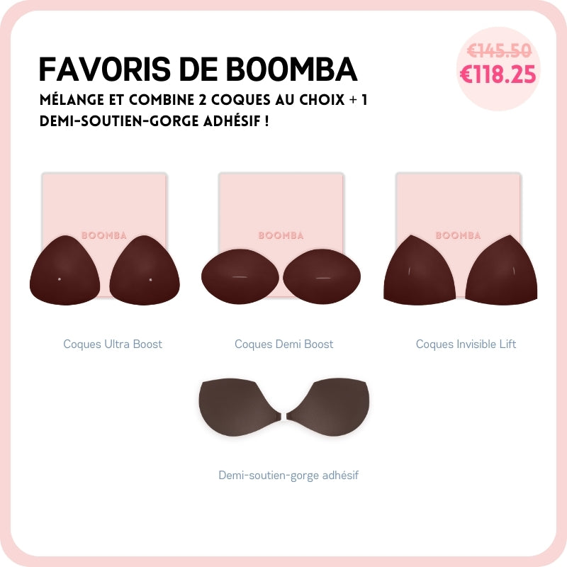 Ce paquet contient 2 paires de coques de votre choix parmi nos coques les plus vendues ainsi que nos fameux Demi Sticky Bra BOOMBA. Nous avons sélectionné nos coques préférées pour créer votre pack essentiels dont vous avez besoin pour se sentir belle en toute occasion.