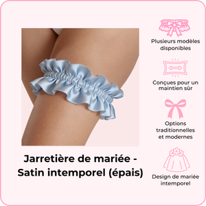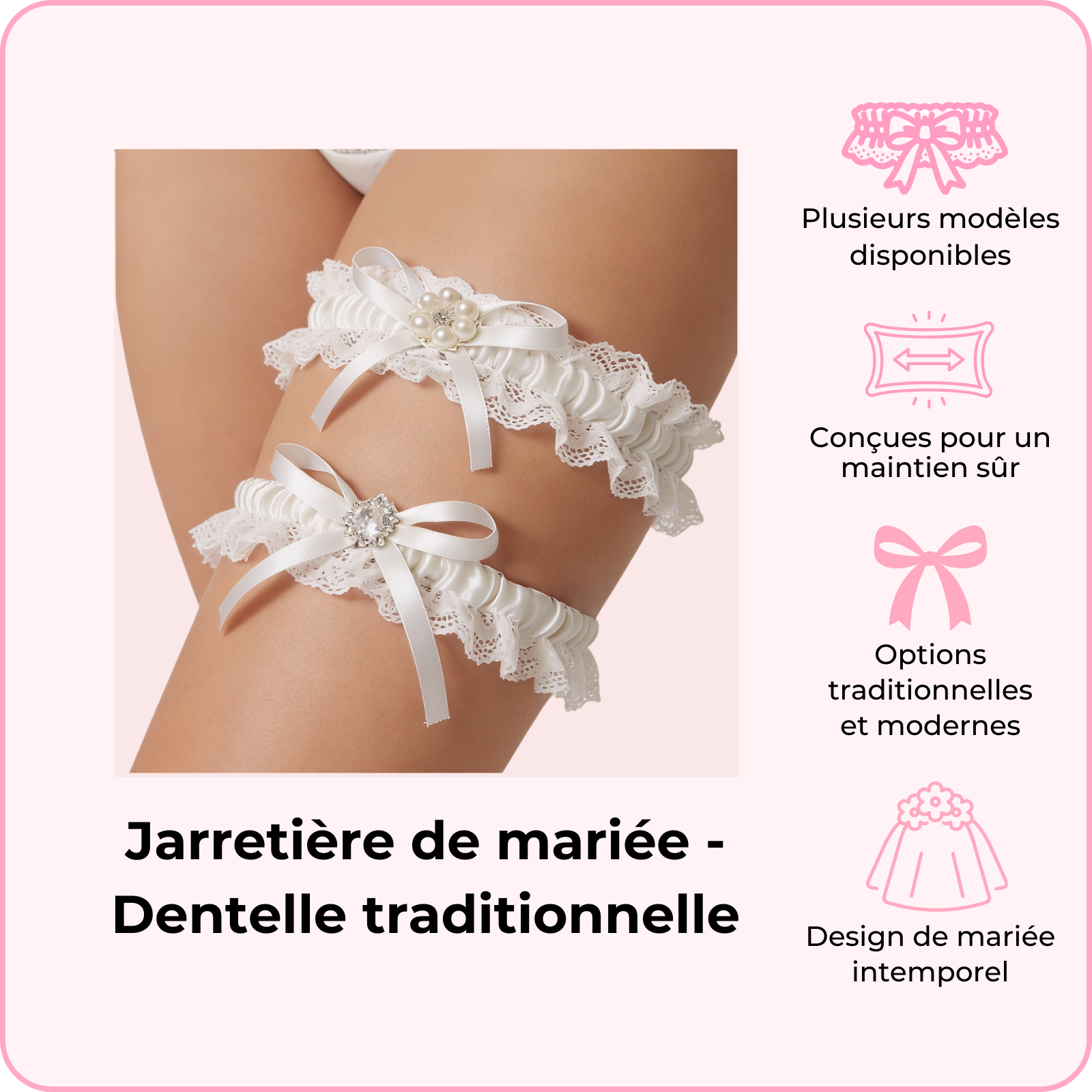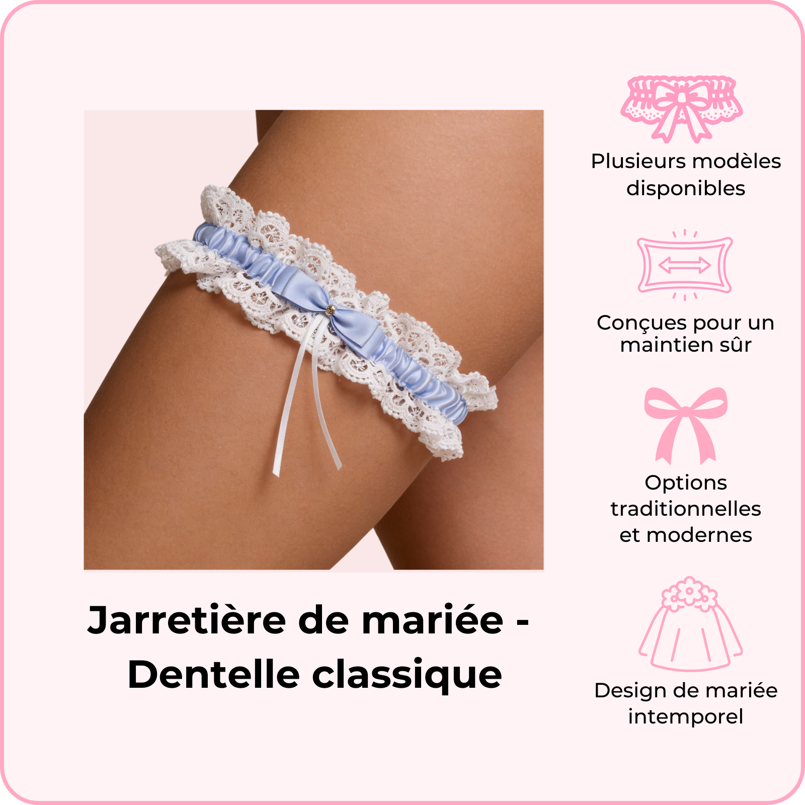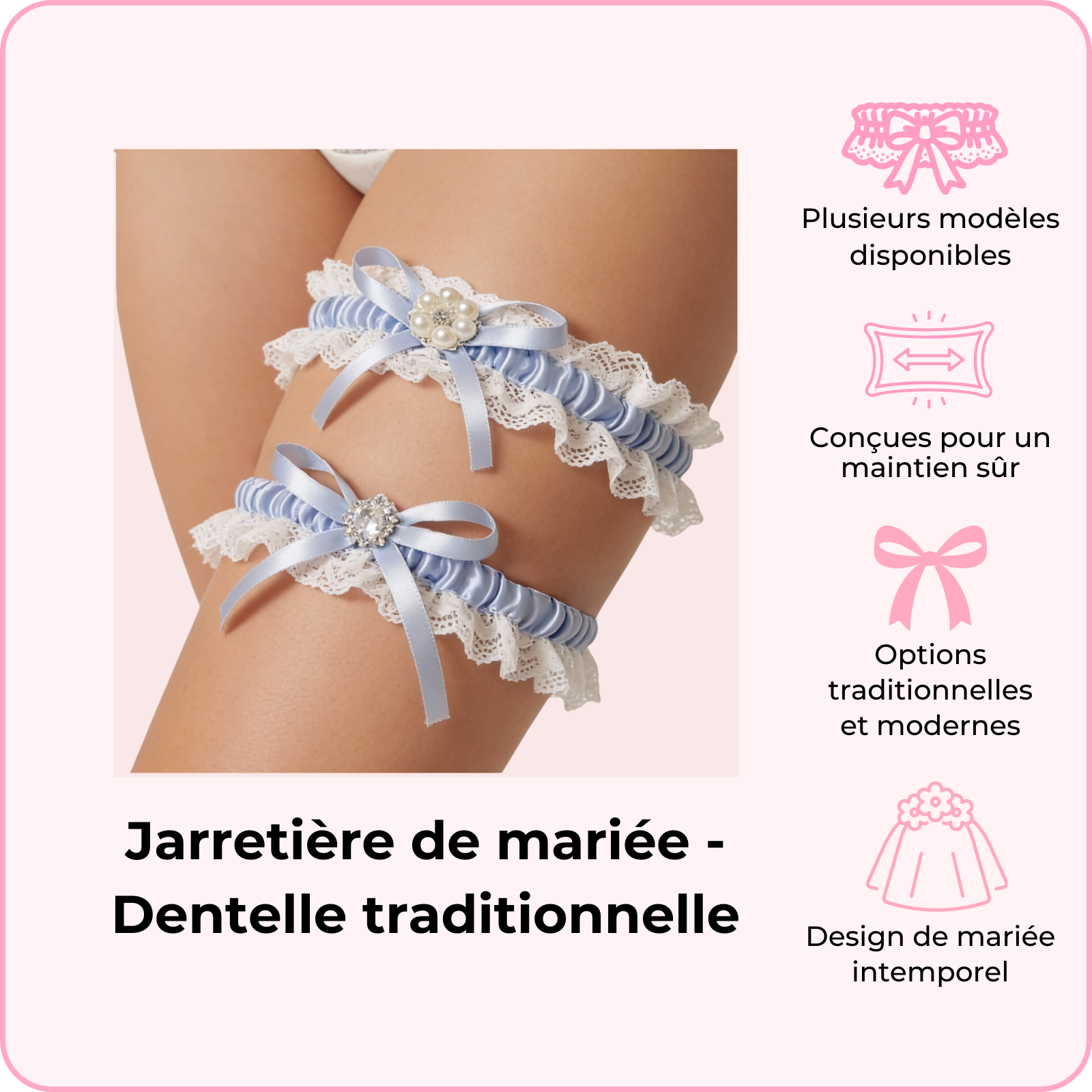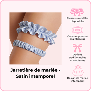 Disponibles dans une variété de styles de la dentelle traditionnelle aux designs modernes, chaque jarretière est fabriquée à partir de tissus doux et délicats, conçus pour rester parfaitement en place tout au long de la journée. Que vous recherchiez « quelque chose de bleu » ou une élégance intemporelle en ivoire, nous avons le style qui correspond à votre vision.