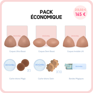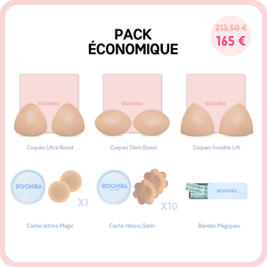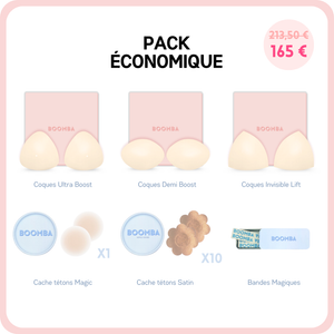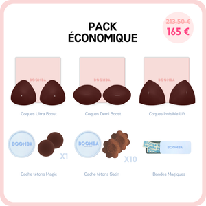 Ce pack contient les trois modèles de coques les plus populaires: Ultra Boost, Demi Boost et Lift Invisible. Il contient également nos meilleures ventes : les Cache-tétons Magiques (adhésif), Cache-tétons Satinés et Ruban Adhésif.