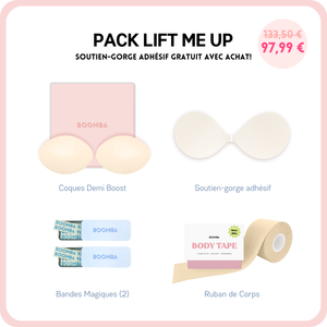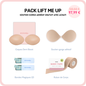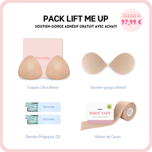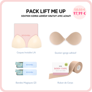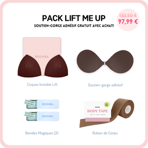 Si vous cherchez à avoir un peu plus de décolleté ou simplement ajouter plus de sécurité à votre tenue, ce pack est parfait pour vous. Ce lot comprend 1 Paire de N'IMPORTE QUELLE coque de votre choix, 1 Soutien-gorge adhésif, 2 Boîtes de Ruban Adhésif et 1 Méga Ruban de Corps. Ce pack vous aidera à avoir un lifting et un volume naturels.