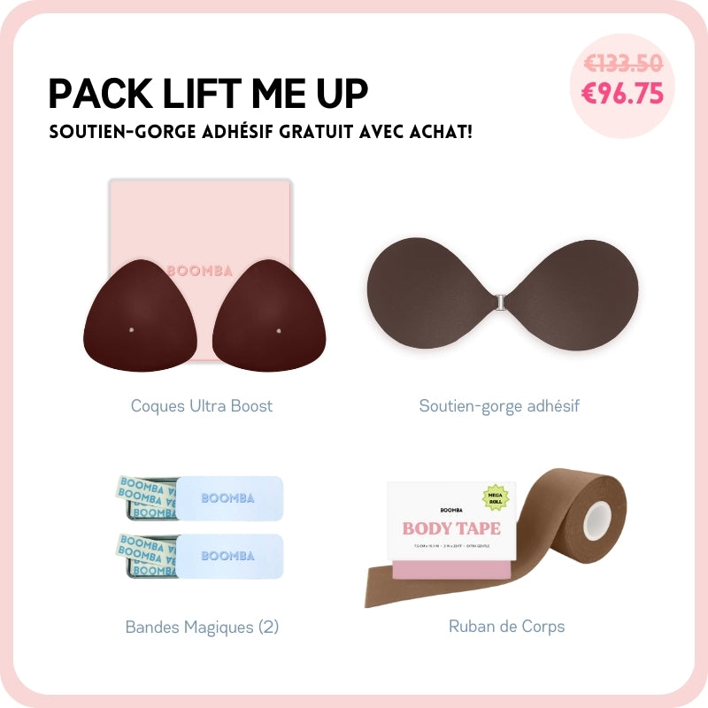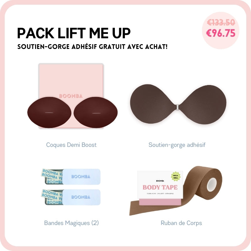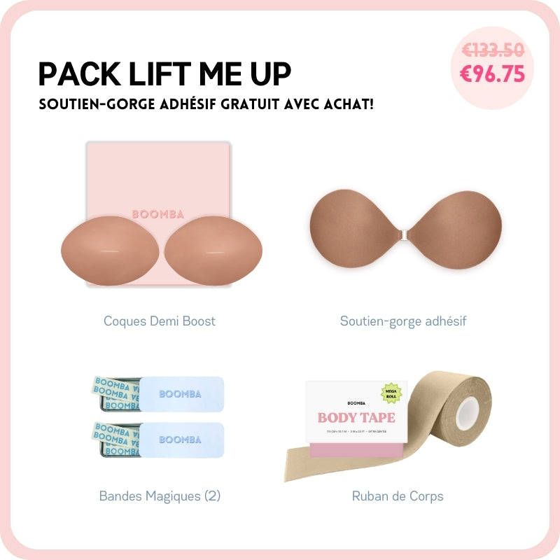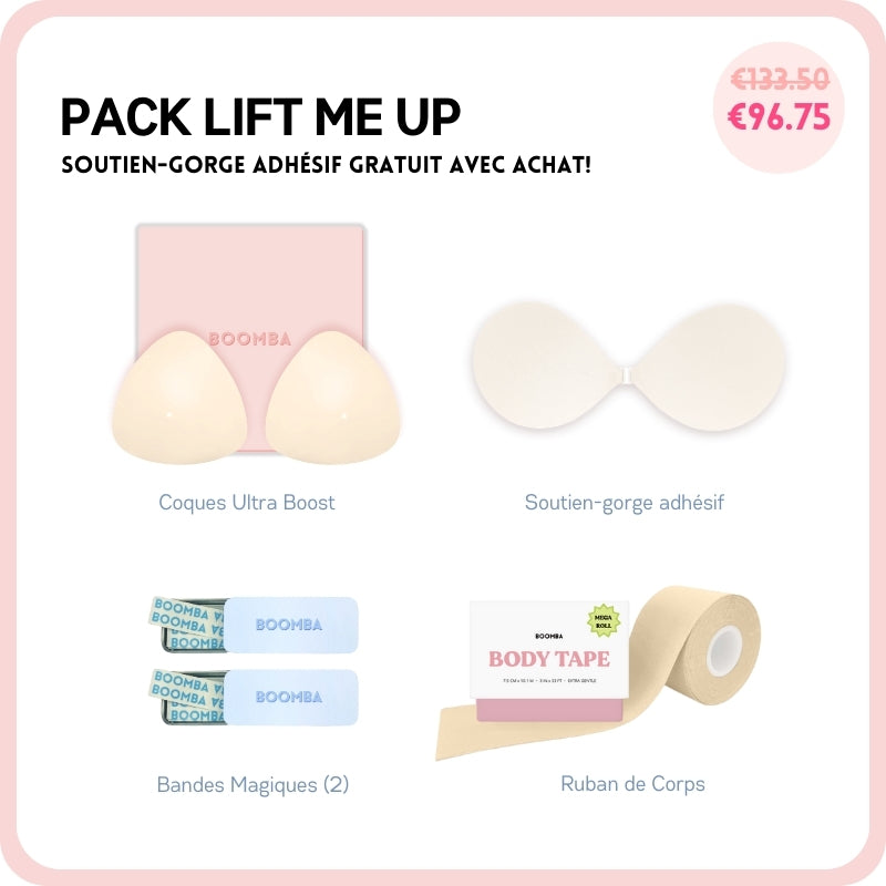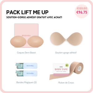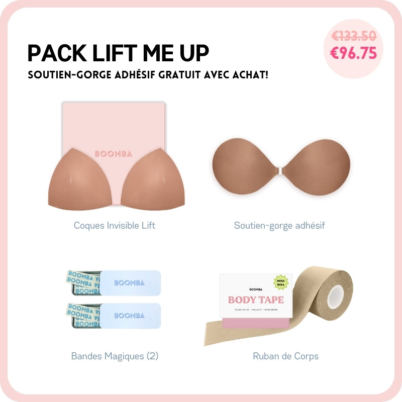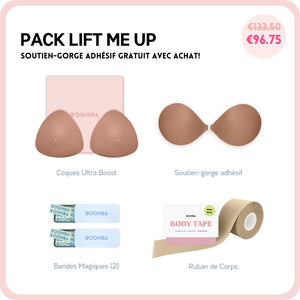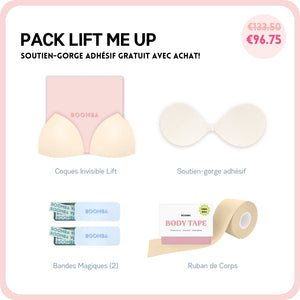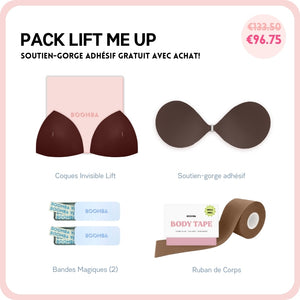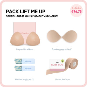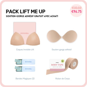 Si vous cherchez à avoir un peu plus de décolleté ou simplement ajouter plus de sécurité à votre tenue, ce pack est parfait pour vous. Ce lot comprend 1 Paire de N'IMPORTE QUELLE coque de votre choix, 1 Sticky Bra, 2 Boîtes de Ruban Adhésif et 1 Méga Ruban de Corps. Ce pack vous aidera à avoir un lifting et un volume naturels.