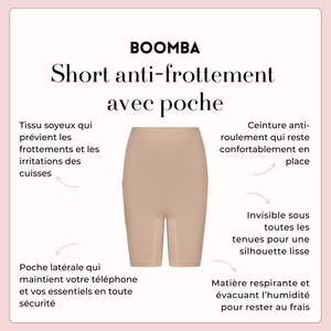 Les frottements entre les cuisses ont enfin trouvé leur adversaire. Les shorts anti-frottements avec poche BOOMBA associent le confort de notre design original à une poche latérale intégrée et discrète, idéale pour garder vos essentiels à portée de main en toute sécurité.